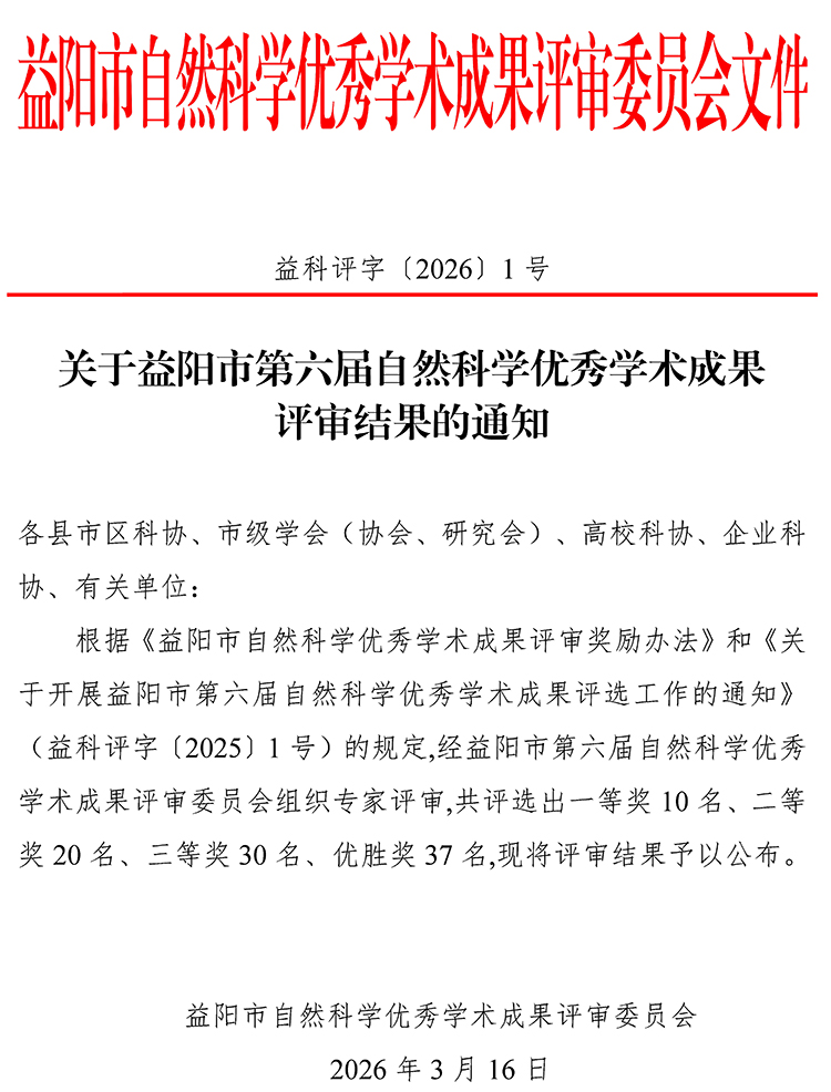 湖南屹林材料技术有限公司荣获益阳市第六届自然科学优秀学术成果一等奖